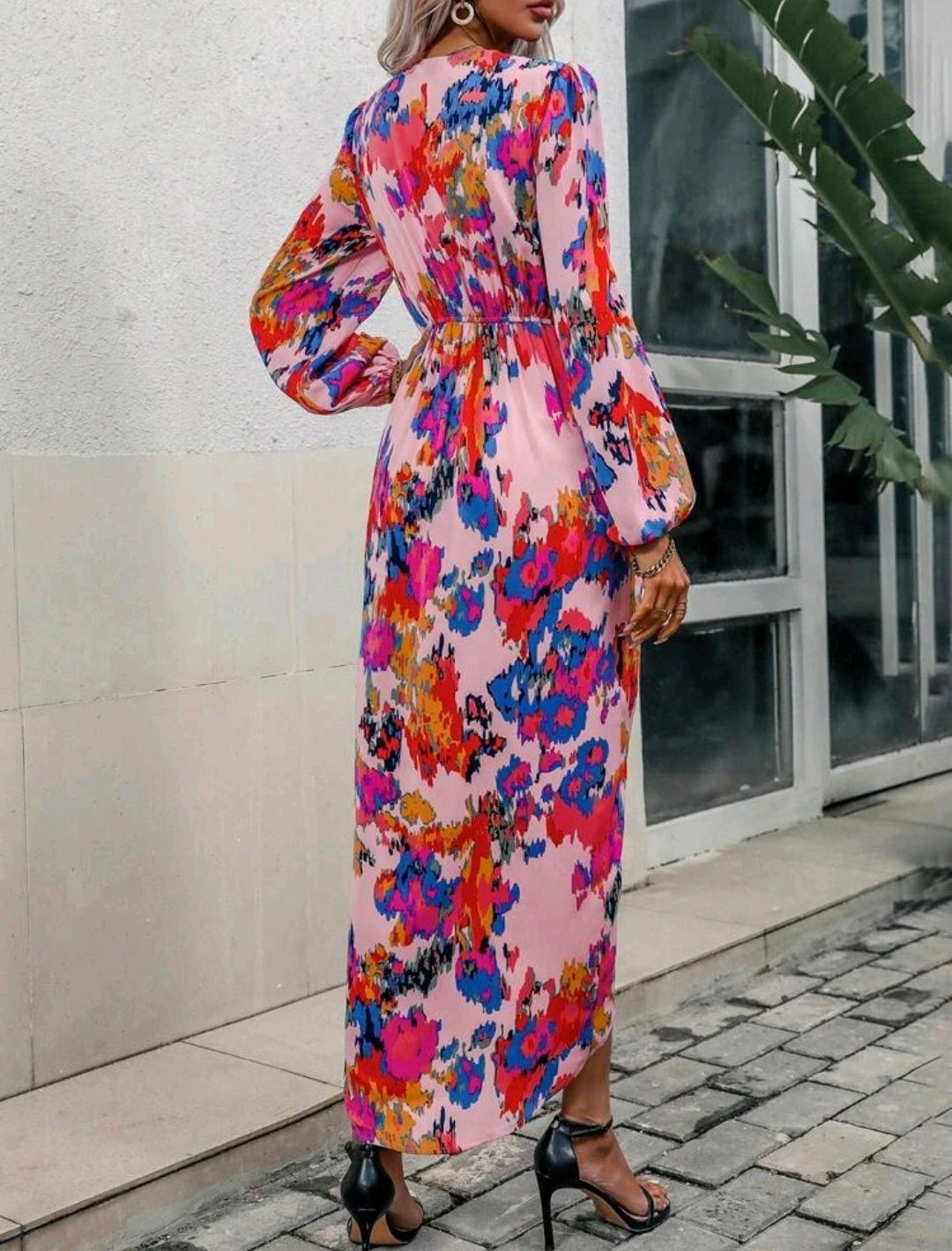 Pink Multicolour Lantern Sleeve Satin Wrap Hem Dress