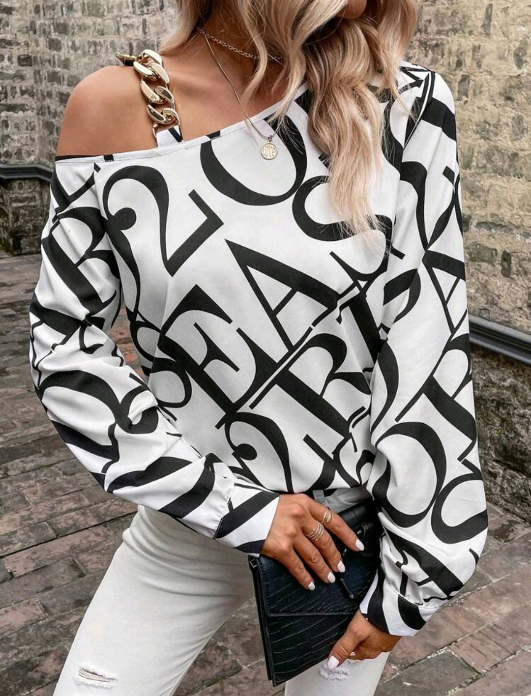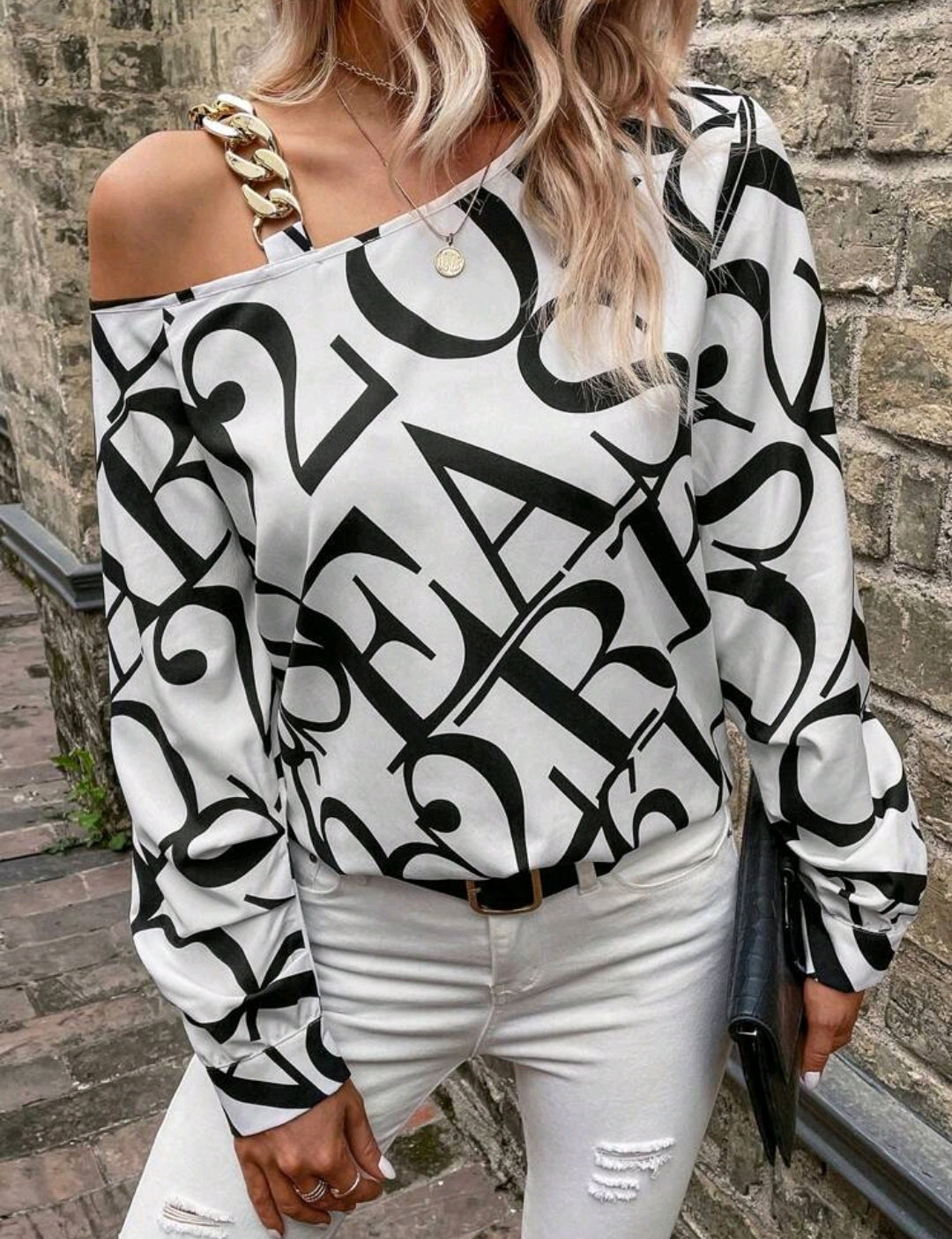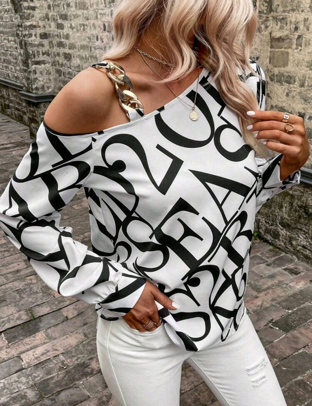 White Letter Print Chain Accent Asymmetric Blouse